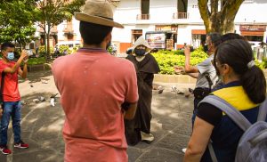 Una vez los participantes apreciaron y exploraron la casona se dirigieron al siguiente punto, allí los esperaba José Antonio, quien compartió una pequeña historia de su personaje y como se realizó la construcción de la catedral, posteriormente se dirigieron al monumento de El Cacique Guane, en este punto los participantes eran recibidos por el personaje de una campesina, quien con su hablado fuerte y golpeado les compartió la historia de los indios Guanes.