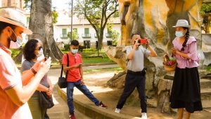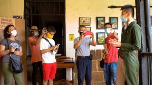 Una vez los participantes apreciaron y exploraron la casona se dirigieron al siguiente punto, allí los esperaba José Antonio, quien compartió una pequeña historia de su personaje y como se realizó la construcción de la catedral, posteriormente se dirigieron al monumento de El Cacique Guane, en este punto los participantes eran recibidos por el personaje de una campesina, quien con su hablado fuerte y golpeado les compartió la historia de los indios Guanes.